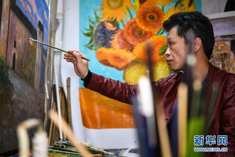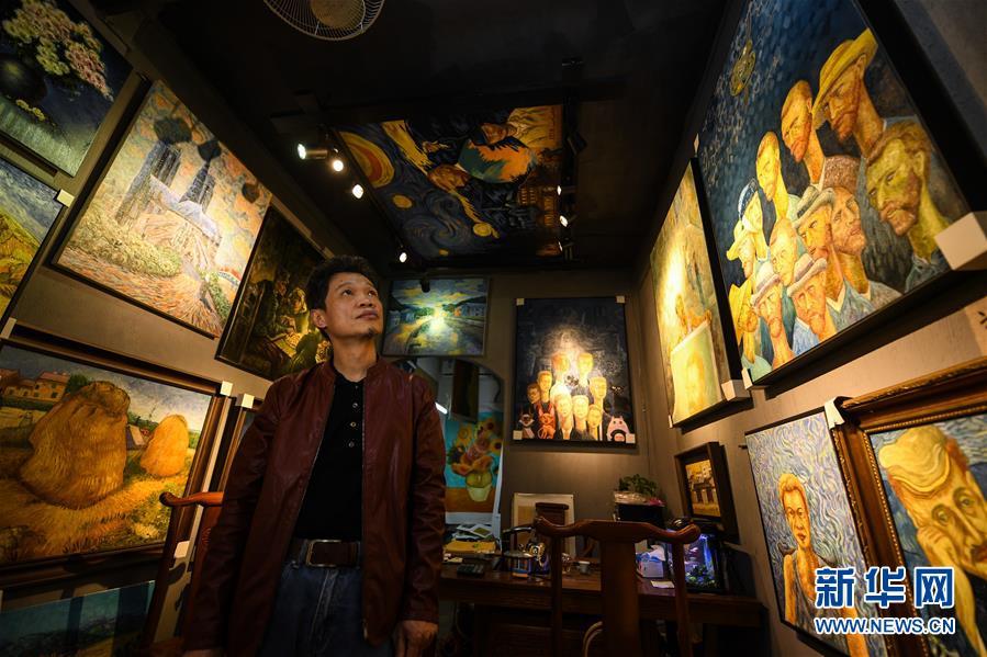 画师赵小勇在大芬村的画室里,周围都是他的作品,一半是临摹梵高的作品,一半是自己的原创作品(1月11日摄)。 新华社记者 毛思倩 摄
