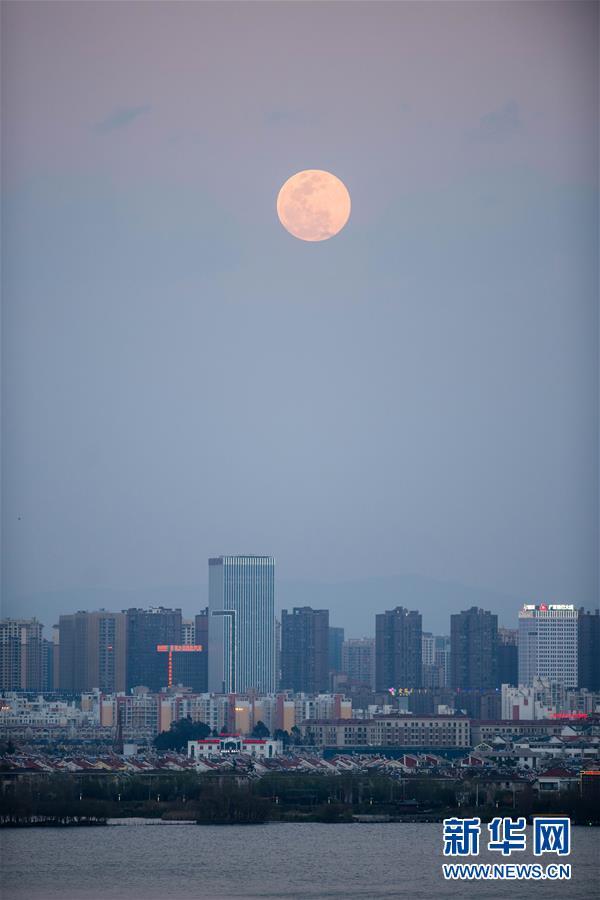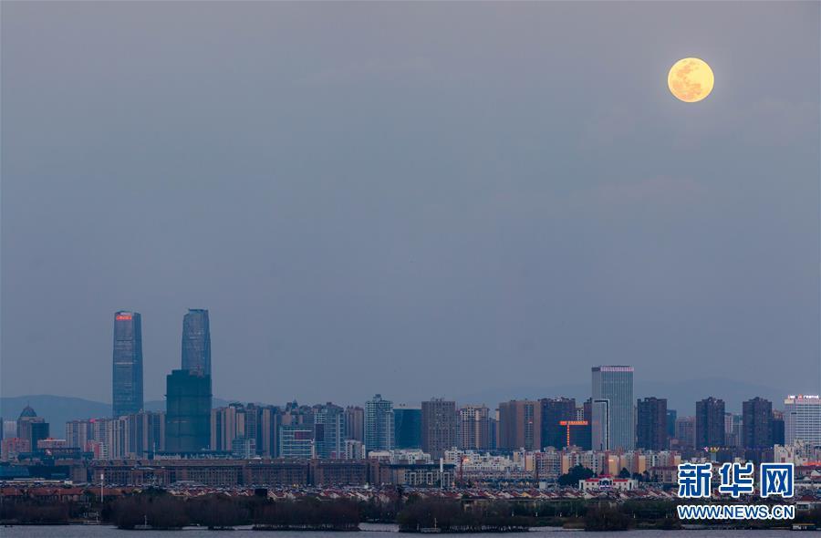 这是2月19日在昆明拍摄的月亮和城市风景。 当日是元宵佳节,本年度第二场“超级月亮”,也是年度“最大最圆月”现身天宇。 据介绍,“超级月亮”是指处于近地点位置附近的满月。此次天象与佳节的“巧遇”,为元宵赏月增加了看点,平添了情趣。 新华社记者 蔺以光 摄