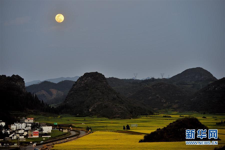 2月19日,一轮圆月从云南省罗平县金鸡峰丛开满油菜花的山间升起。 当日是元宵佳节,本年度第二场“超级月亮”,也是年度“最大最圆月”现身天宇。 据介绍,“超级月亮”是指处于近地点位置附近的满月。此次天象与佳节的“巧遇”,为元宵赏月增加了看点,平添了情趣。 新华社记者 秦晴 摄