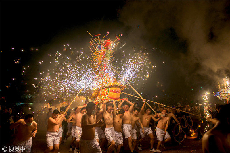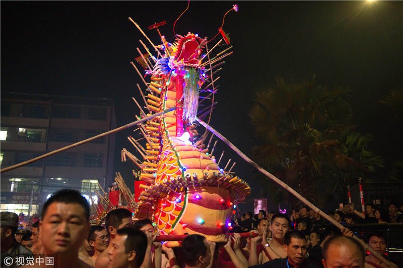 2019年2月19日元宵夜,素有中国火龙之乡美称,广东省丰顺县埔寨镇,激情上演,火龙飞舞,烧鱼烧龙,精采表演,欢庆元宵,场面蔚为壮观,来自四面八方观众约60000人,专程前来观看激烈烧龙盛况。黄少华/视觉中国
