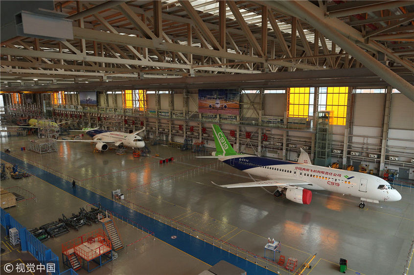 支架安装、尾段装配……在C919飞机机舱内、驾驶室等各工位技术人员按计划工作着。一名技术人员告诉记者:“我们在上海今年没外出,家离得近,到公司加班方便,家人都很支持我,这是我的责任”。图为2019年2月8日,上海。在浦东基地,C919大型客机三机齐聚厂房。