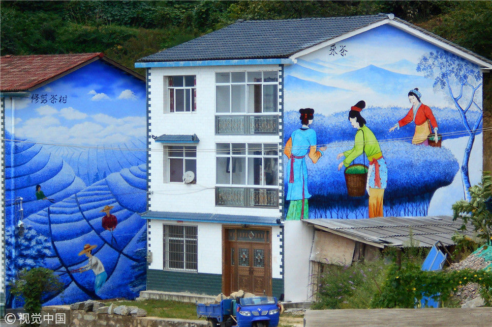 2018年8月18日,湖北省宜昌市夷陵区邓村乡一栋茶农民居上手绘的“青花瓷”墙壁画“采茶”和“修剪茶树”。张国荣/视觉中国