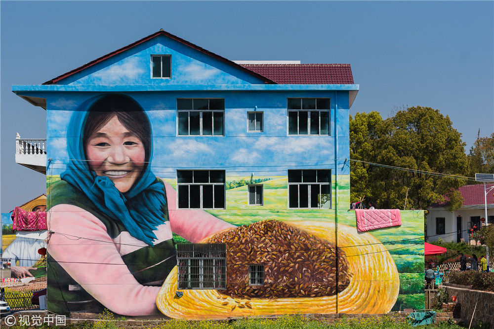 2017年03月27日,江西上饶,皂头镇三联村,一座耕读传家的壁画村落。三联壁画村,走进村落,第一眼,便见到房屋外壁上的巨型壁画,扎着头巾的妇人手捧着种子,播种希望;另一座房屋外壁,农民伯伯手捧稻谷,脸上满是丰收的喜悦。这个村落,邀请从中央美院的走出的专业壁画创作机构柯理沃,由刘璐、田馥榛创作并带领中国壁画精英团队,将房屋外壁当做画布,用五彩斑斓的画笔,绘制巨型3D壁画,诉说着耕读传家的传统,现代农民的生活。在这里,艺术不需要仰视,不再需要朝拜,艺术就在每日生活的院墙间,伴随着泥土的芬芳。白墙黑瓦间,一幅幅色彩斑斓的3D壁画,将乡间的常见的景象画在墙上,也让房屋外墙,成为一道绚烂的风景。巨型的水车、农耕时代的耕牛、现代的收割机,绚烂的巨型壁画,描绘出农村童话般的景象,有“锄禾日当午,汗滴禾下土”的艰辛,更有“稻花香里说丰年,听取蛙声一片”的欣喜。这是我能想到的,农村最美的样子。觉非行记/视觉中国
