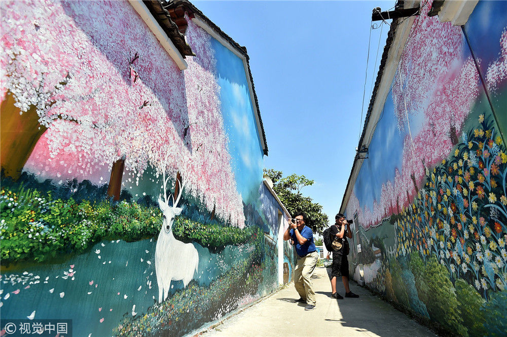 7月21日,摄影爱好者正在扬州市瓜洲村拍摄世外桃源般的“童话大世界”观赏彩绘作品。庄文斌/视觉中国