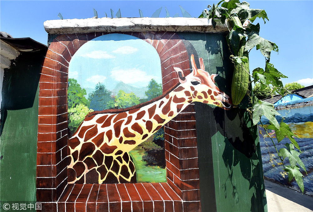 2017年7月21日,扬州瓜洲村栩栩如生彩绘作品与村舍自然环境融为一体,妙趣横生。庄文斌/视觉中国