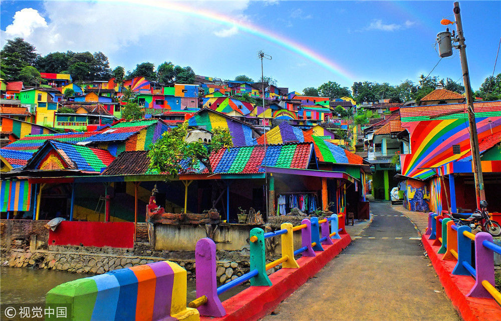 2017年5月17日讯(具体拍摄时间不详),印尼爪哇省兰萨里,当地一个不知名的贫困村,通过当地居民和政府的努力,摇身变成了光彩夺目的“彩虹村”,吸引着世界各地的游客。据悉,当地居民花费了3亿印尼卢比(约合人民币15万元)将村庄改造成了一处旅游胜地,参观者也逐渐增多。 当地居民手工绘制了232座房屋的裸墙,历经一个多月才完成,由此昔日不起眼的小村庄变成了光彩夺目的“彩虹村”,也因此在社交媒体上一炮而红。该地区的文体部门负责人表示一座房子最少有三种颜色。当地人也充分利用这个机会,把当地的特产卖给前去参观的游客。现在230多座房屋已经完成改造。附近三宝垄市的印度尼西亚建筑协会为该村庄提供了人力和物力支持。swns/视觉中国