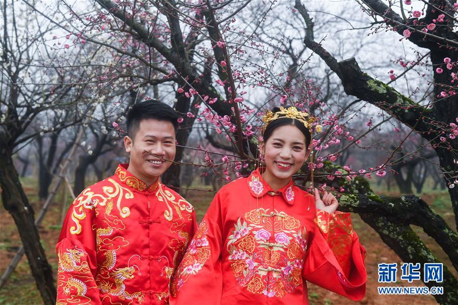 2月21日,一对新人在连心村梅园中举行的集体婚礼上留影。 新华社记者 徐昱 摄