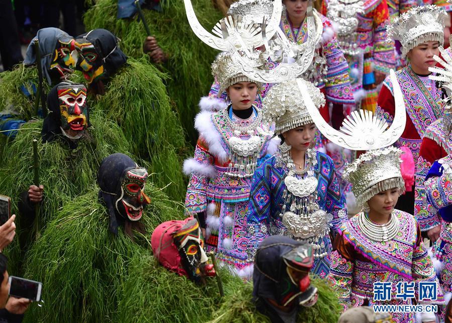 在广西融水苗族自治县安陲乡“十七坡”现场,苗族群众跳芒蒿舞和芦笙踩堂舞(2月21日摄)。 “坡会”是春节期间广西融水苗族自治县境内以苗族为主的多个少数民族聚会娱乐的民间传统节日,是展示绚丽多彩的苗族文化的主要窗口,长期以来受到国内外游客的青睐。“苗族系列坡会群”2006年入选第一批国家级非物质文化遗产名录。 近年来,融水充分利用民族风情浓郁、旅游资源丰富这一优势,创新旅游发展模式,将旅游业打造成为脱贫攻坚的重要产业支撑,让苗山群众走出了一条通过旅游扶贫促产业发展的致富路。2018年,全县接待国内外游客687.79万人,实现旅游总收入78.47亿元。过去两年,每年有近万人通过旅游实现脱贫摘帽。 新华社记者黄孝邦摄