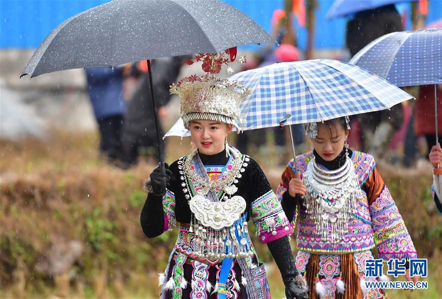在广西融水苗族自治县安太乡,苗家姑娘在雨中赶坡会(2月17日摄)。新华社记者黄孝邦摄