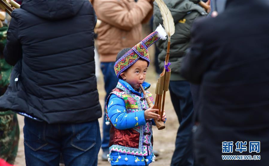 在广西融水苗族自治县安陲乡大田村坡会上,苗族儿童在吹芦笙(2月22日摄)。新华社记者黄孝邦摄