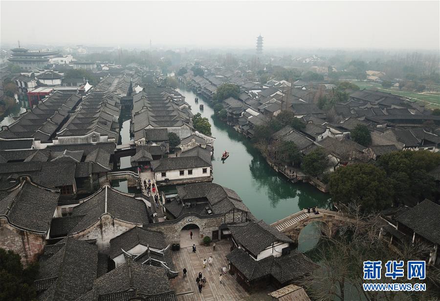 2月25日,游人在乌镇游览观光(无人机拍摄)。 随着气温升高,浙江省桐乡市乌镇景区春意萌动。 新华社记者翁忻旸摄