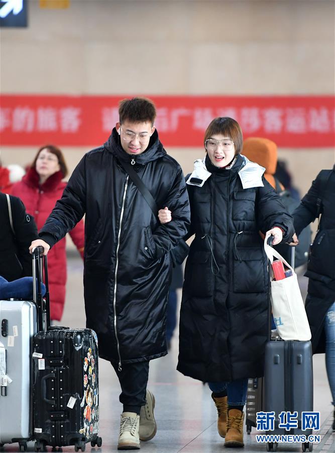 在天津站,张世玉(右)和吕新(左)刚下火车准备出站(2月1日摄)。