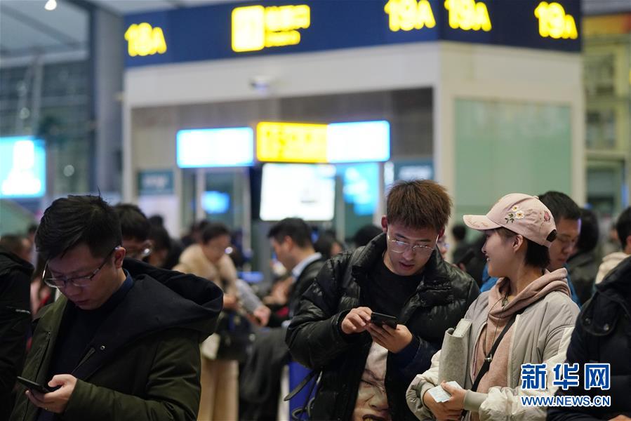 2月22日晚,张世玉(前右一)与吕新(前右二)在北京南站等候回天津的火车。 新华社记者 鞠焕宗 摄