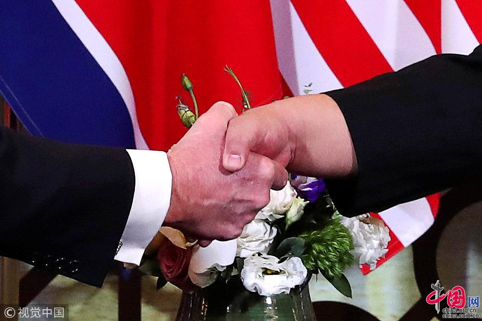 以12面交错摆放的朝美两国国旗为背景,朝鲜最高领导人金正恩与美国总统特朗普时隔8个多月后,再次在聚光灯下握手、微笑、寒暄。