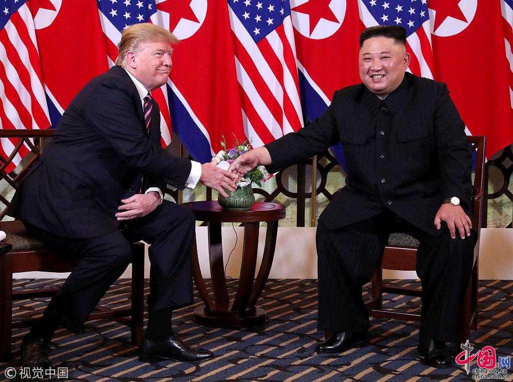 27日晚,朝鲜最高领导人金正恩与美国总统特朗普时隔8个多月后在越南首都河内会面,拉开朝美领导人第二次会晤的序幕。图片作者:LEAH MILLIS/视觉中国