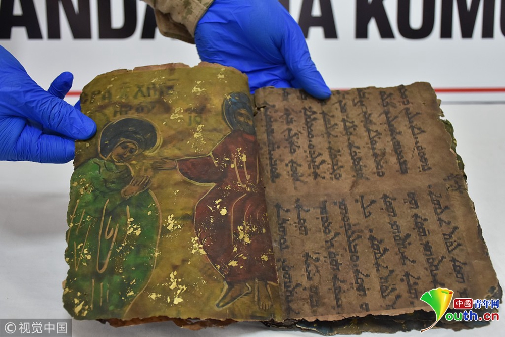 当地时间2019年2月28日,土耳其迪亚巴克尔,一份有800年历史的写有希伯来文字和宗教图案的皮革书卷曝光。这本书卷将被送到土耳其的手稿机构进行审查。这本书配有宗教插图,由约22页的皮革制成。图片来源:视觉中国
