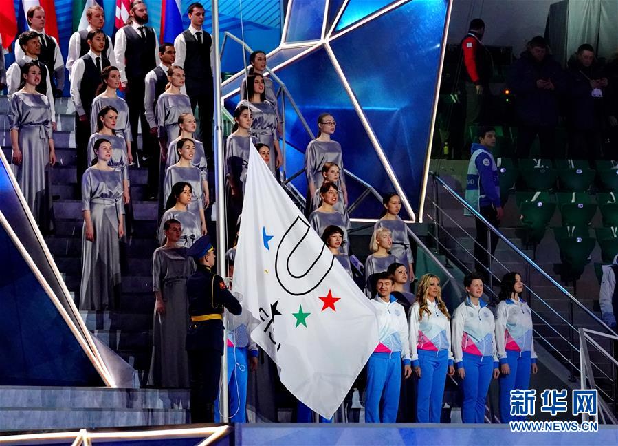 3月2日,第29届世界大学生冬季运动会在俄罗斯克拉斯诺亚尔斯克市开幕。 这是国际大学生体育联合会会旗在开幕式上升起。(3月2日摄) 新华社记者杨世尧摄