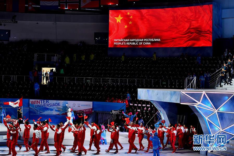 3月2日,中国体育代表团成员在开幕式上入场。 当日,第29届世界大学生冬季运动会在俄罗斯克拉斯诺亚尔斯克市开幕。 新华社记者王东震摄