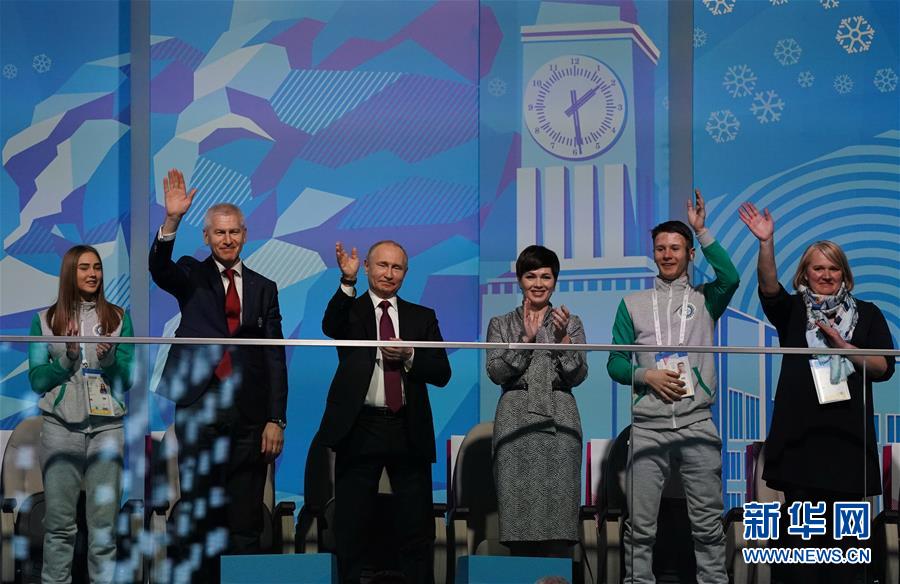 3月2日,俄罗斯总统普京(左三)出席开幕式。 当日,第29届世界大学生冬季运动会在俄罗斯克拉斯诺亚尔斯克市开幕。 新华社记者杨世尧摄