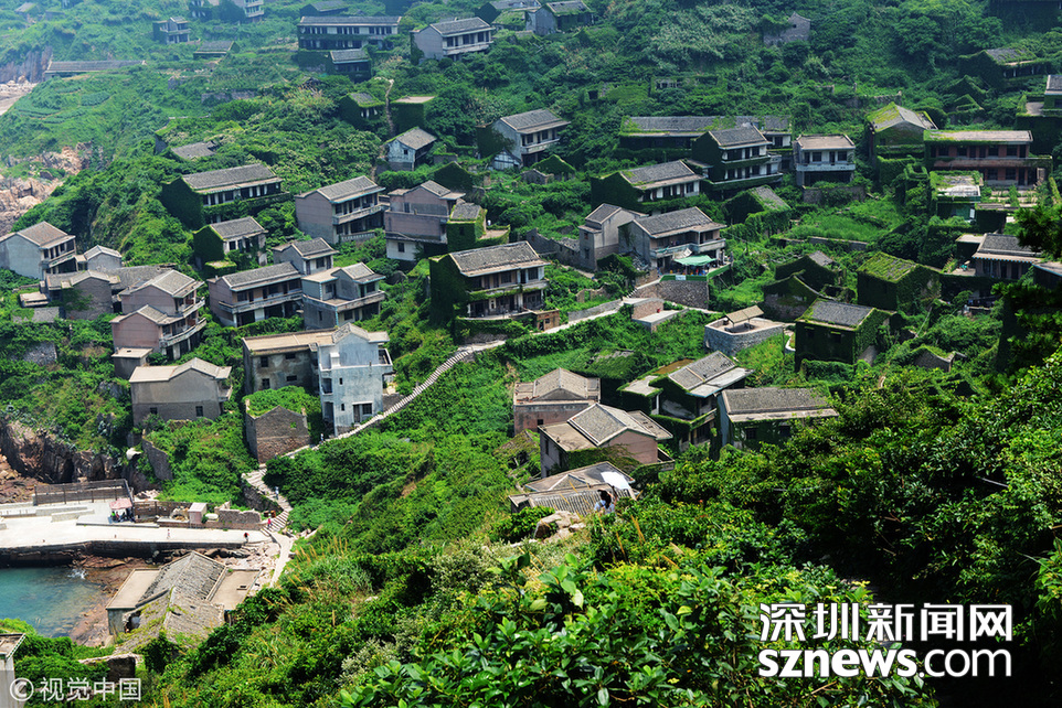 2018年8月8日,浙江舟山,掩映在绿色植被中的“无人村”,暑假里日均接待游客5、600人,高峰期每天到访者达千人。