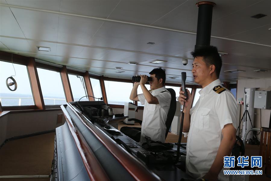 “雪龙”号船长(右)和值班驾驶员在驾驶台工作中(3月3日摄)。 北京时间3月4日凌晨3时28分,“雪龙”号极地考察船载着中国第35次南极科考队队员,由东经107度01分穿越赤道,返回北半球。 新华社记者 刘诗平摄