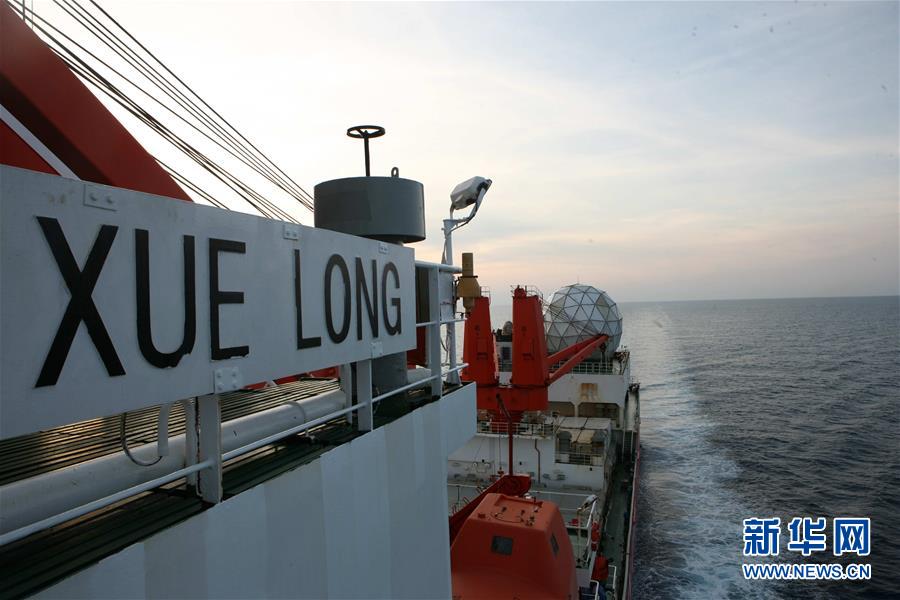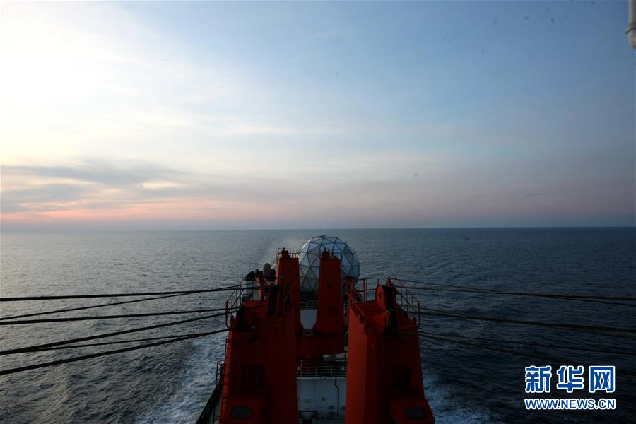 在北半球航行的“雪龙”号(3月4日摄)。 北京时间3月4日凌晨3时28分,“雪龙”号极地考察船载着中国第35次南极科考队队员,由东经107度01分穿越赤道,返回北半球。 新华社记者 刘诗平摄
