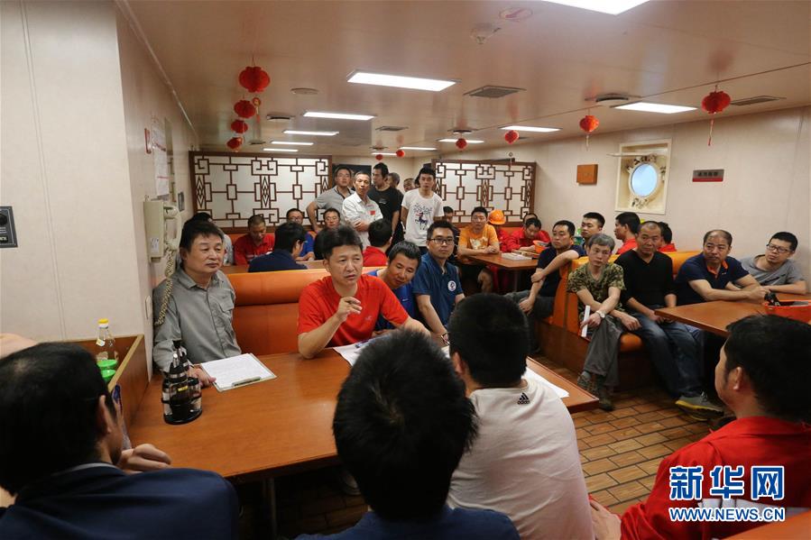 “雪龙”号船上开会部署防海盗行窃(3月1日摄)。 北京时间3月4日凌晨3时28分,“雪龙”号极地考察船载着中国第35次南极科考队队员,由东经107度01分穿越赤道,返回北半球。 新华社记者 刘诗平摄
