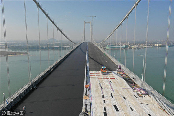 2019年1月30日,粤港澳大湾区又一重要过江通道虎门二桥项目的两座主桥钢桥面环氧沥青铺装工程完成,预计今年5月1日前通车。当天,虎门二桥大沙水道桥的桥面上机械轰鸣,两台摊铺机缓缓驶离沥青面,七台震荡压路机对该桥左幅环氧沥青的上面层施工进行最后一道循环碾压工序。视觉中国