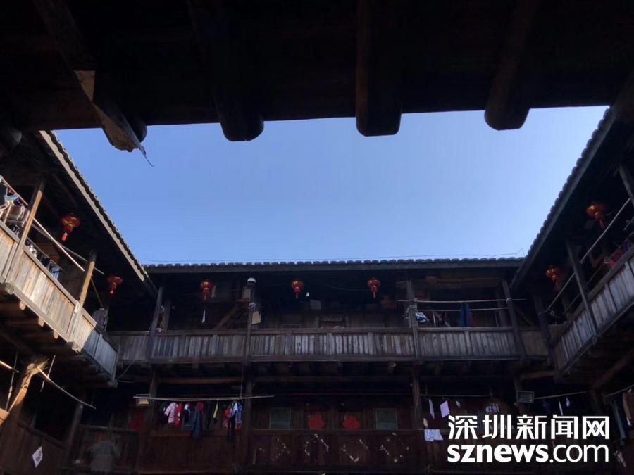 楼为5层结构,每层有54间大小相同的斧状房间,底层厨房每家有一口水井,井水清净可食;这座土楼建成后不久,楼内回廊木柱便开始从左向右倾斜,最大倾斜度为15度,但经受住了几百年风雨侵蚀和无数次地震,故也被称为“东歪西斜楼”。孙卫南 摄