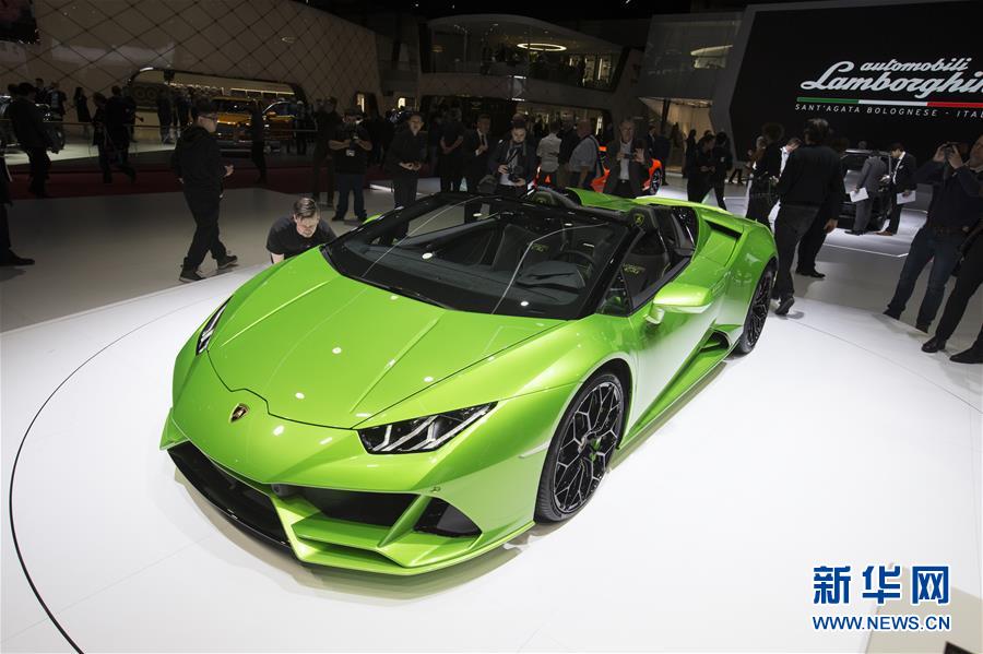 3月5日,在瑞士日内瓦国际车展媒体日预展上,人们观看兰博基尼Huracan EVO Spyder跑车。 第89届日内瓦国际车展当天举行媒体日预展。车展将于3月7日正式拉开帷幕,全球约220家汽车及零配件厂商参展。 新华社记者 徐金泉 摄