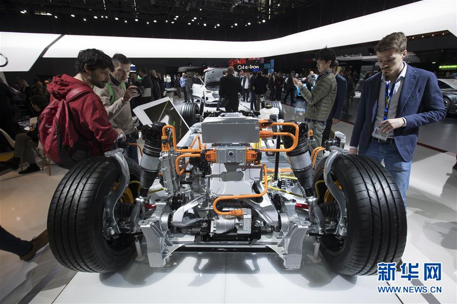 3月6日,在瑞士日内瓦国际车展上,人们观看奥迪新款e-tron电动车传动系统。 新华社记者徐金泉摄