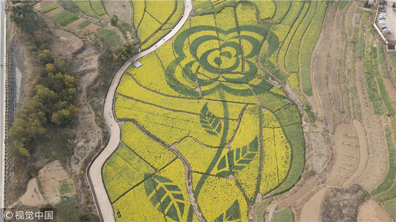 2019年近日,在云南省安宁市山口村,油菜花田里“长出”一朵巨大的“山茶花”,吸引游客到此观赏拍照。图为3月1日,航拍油菜花田中的山茶花图案。刘冉阳(云南分社)/中新社/视觉中国