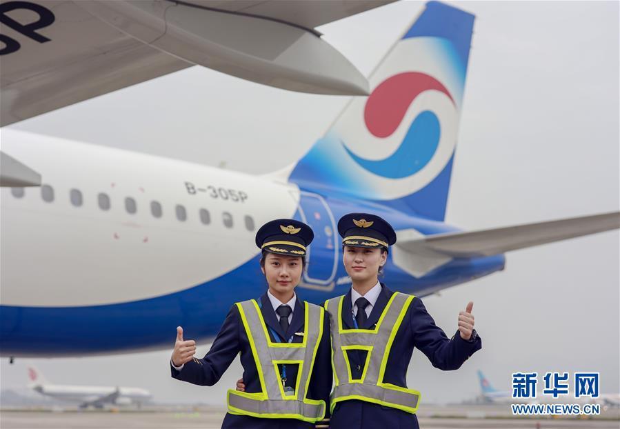 在重庆江北国际机场,飞行员杜倩(右)和杨静(左)在共同上机的航班前合影(3月6日摄)。 新华社记者 刘潺 摄