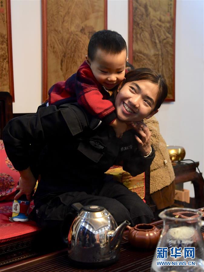 福建省漳州市公安局巡特警支队三大队女特警高明珠回到家里与儿子亲密互动(2月19日摄)。 新华社记者 姜克红 摄