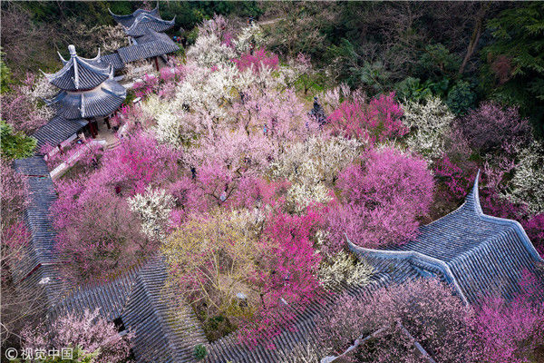 2019年3月9日,南京,随着天气转暖,雨花台风景区梅花盛开,满园春色吸引游人前来踏青赏花。