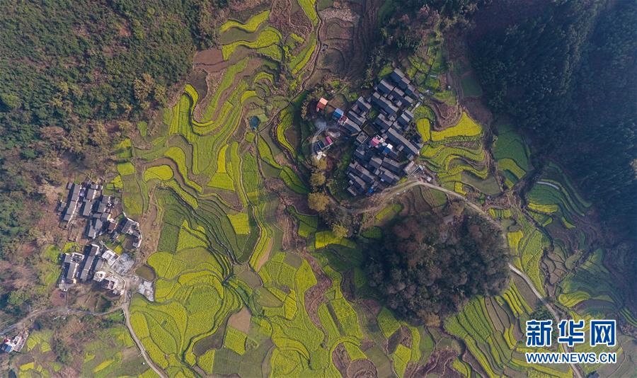 广西融安县东起乡长丰村的田园春色(3月10日无人机拍摄)。 近日,随着气温持续回升,广西融安县境内的油菜花开放,春意盎然。 新华社记者 黄孝邦 摄