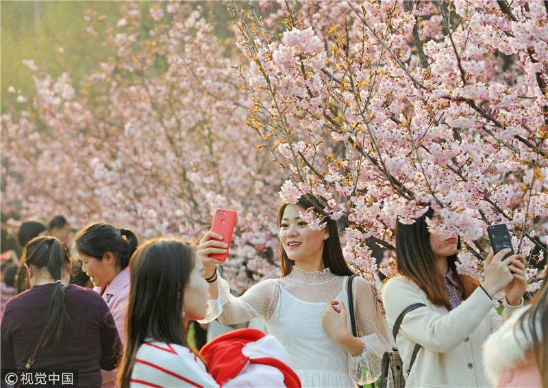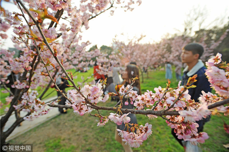 2019年3月10日,武汉大学校园里,早樱和梅花迎春绽放,吸引不少市民前来赏游。承影/视觉中国 编辑/陈进