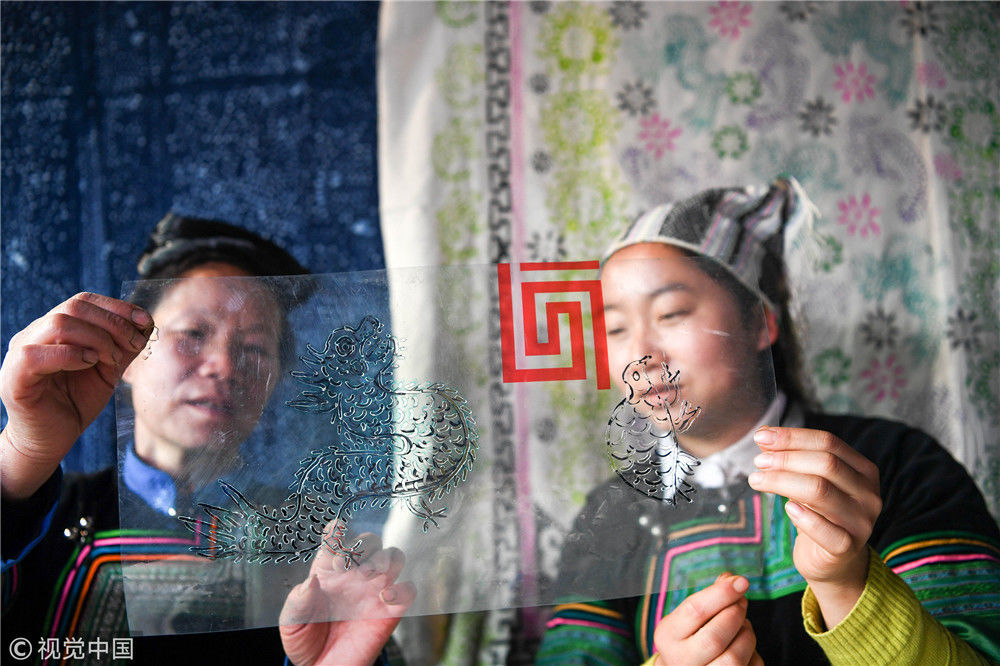 侗族豆染是用黄豆粉、石灰粉、侗家米醋等原料,搅拌制成防染剂,然后用镂空图案模板将防染剂涂到侗家土布上,经过蓝靛靛染、清洗去掉防染剂等工序,形成图案精美、环保耐用的染品。图为2019年3月11日,在贵州省榕江县朗洞镇色边村,侗族妇女石庆芝(左)和女儿田爱吉在查看豆染镂空图案模板。王炳真/视觉中国