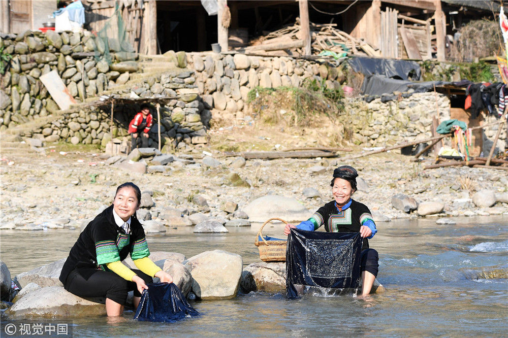 2019年3月11日,在贵州省榕江县朗洞镇色边村,侗族妇女石庆芝(右)和女儿田爱吉在清洗豆染布匹。