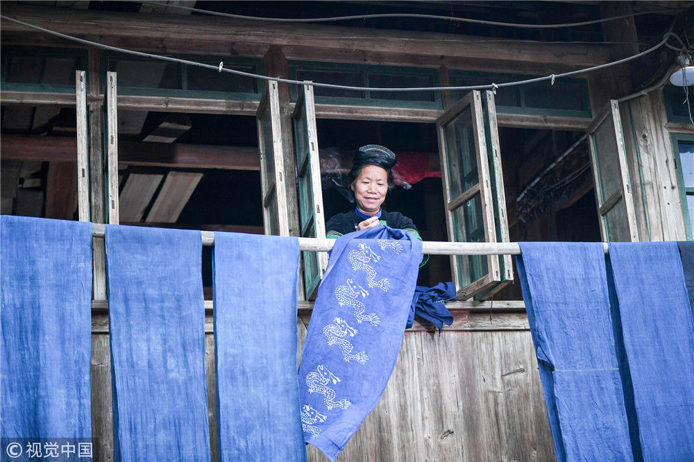 侗族豆染与蜡染齐名,但因为用料讲究、做工复杂,掌握豆染技艺的人不多。如今,随着便捷的现代纺织品不断深入人们生活,豆染技艺濒临失传。图为2019年3月11日,在贵州省榕江县朗洞镇色边村,侗族妇女石庆芝在晾晒豆染布匹。