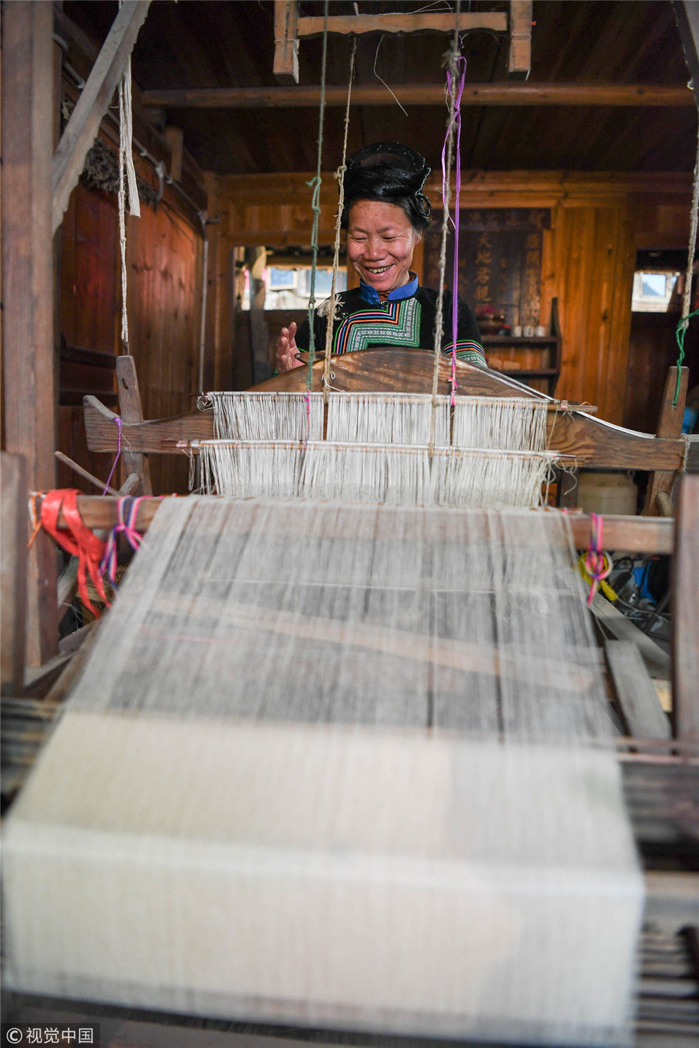 2017年12月,石庆芝从朗洞镇卫生院退休后,专注于侗族豆染技艺的传承与发展,利用空闲时间传承豆染技艺,“将侗族豆染技艺传承下去,是我当前最大的责任,也是我义不容辞的职责。”图为2019年3月11日,在贵州省榕江县朗洞镇色边村,侗族妇女石庆芝在织布。