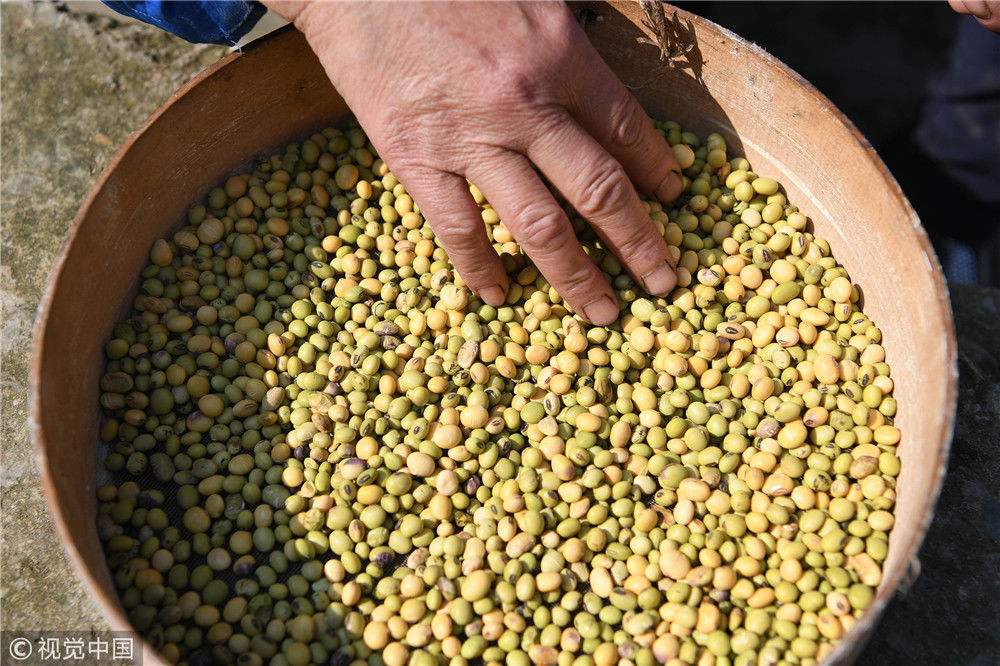 2019年3月11日,在贵州省榕江县朗洞镇色边村,侗族妇女石庆芝在选黄豆制作豆染防染剂。