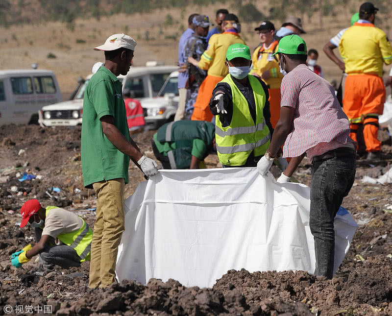 当地时间2019年3月12日,埃塞俄比亚比绍夫图,调查人员和救援队在埃塞俄比亚航空公司ET302航班坠毁地点收集乘客个人物品和其它材料。