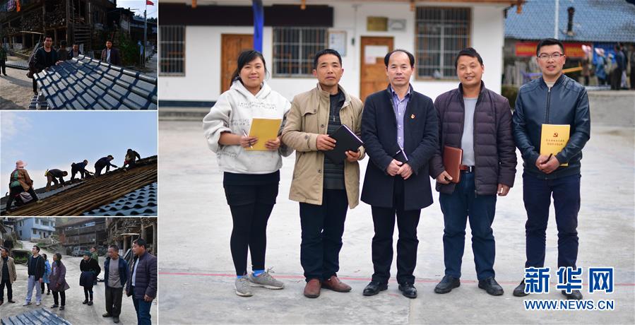 拼版照片:右图为在广西融水苗族自治县杆洞乡小河村,驻村第一书记谢君(中)和党员们在一起(3月13日摄);左上中下图为驻村扶贫队员、党员和群众一起,为五保户修缮住房(3月13日摄)。近年来,小河村依靠发展金银花、药材等产业,已于2016年实现脱贫。 广西融水苗族自治县是国家扶贫工作重点县,全县“九山半水半分田”,交通不便,生存环境较为恶劣,脱贫攻坚任务艰巨,目前还有4万多贫困人口。 面对经济发展落后、贫困面广且程度深的现状,当地积极探索推行党建新模式,组建屯级党支部委员会、公共事务理事会、公共事务监事会、纠纷调解委员会、产业发展协会等,以充分发挥基层党组织的战斗堡垒作用。 在大苗山脱贫攻坚第一线的各个苗寨里,大批扶贫干部、驻村第一书记,和村干部、党员、致富带头人、贫困群众一道,组成一支支脱贫攻坚队伍,团结一心,共同奋斗,加快实现脱贫致富。 新华社记者 黄孝邦 摄