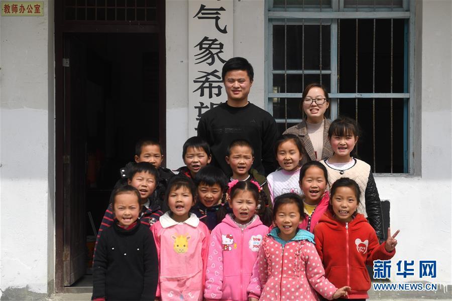 陈伟(后排左)和黄晓青(后排右)在学校与学生们合影(3月15日摄)。 在安徽省岳西县青天乡老鸭村上海气象希望小学,“90后”陈伟和妻子黄晓青扎根大山深处,用心教育山里的孩子。 陈伟和黄晓青的老家在安徽省怀宁县小市镇,2017年,他们通过考试成为老鸭村上海气象希望小学的老师,从此以校为家,吃住都在学校。现在,这对夫妻教师把两个女儿也带在身边,上课时由陈伟的母亲帮忙照看孩子。 老鸭村上海气象希望小学只有7名教师,夫妻俩除了自己负责的语文和数学主课以外,还要兼上音乐、体育等课程。陈伟告诉记者,山区小学缺少老师,他希望有更多的年轻老师到基层来。 “每天和学生们在一起,真的很快乐。”黄晓青说。 新华社记者 张端 摄