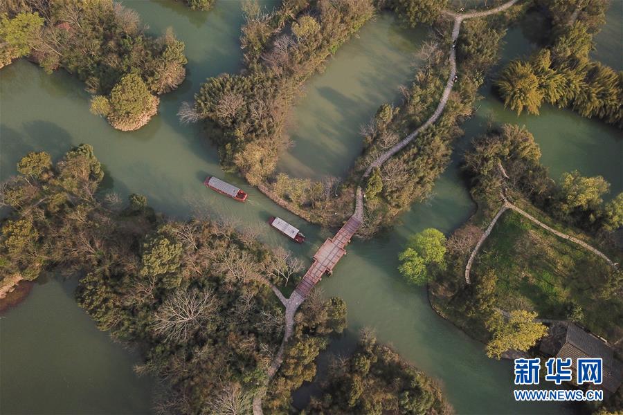 3月16日,游客乘坐游船在西溪湿地观光(无人机拍摄)。 天气渐暖,杭州西溪国家湿地公园内春意盎然,吸引大批游客前来观光。 新华社记者 黄宗治 摄