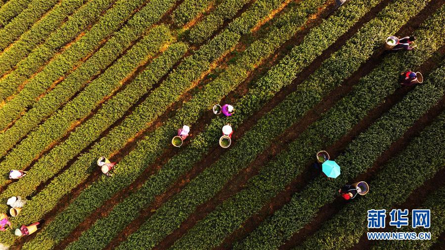 3月18日,茶农在位于白象山的定心茶园采摘春茶(无人机拍摄)。新华社记者 王全超 摄
