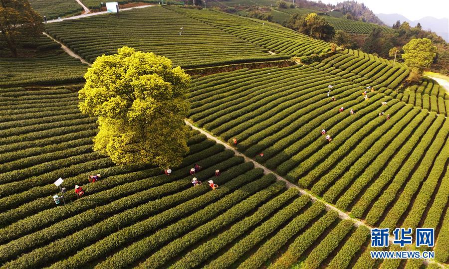 3月18日,茶农在位于白象山的定心茶园采摘春茶(无人机拍摄)。新华社记者 王全超 摄