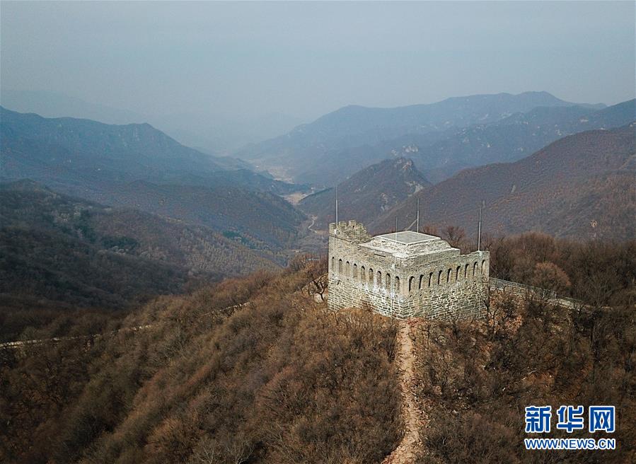 这是3月18日无人机拍摄的九眼楼长城。 九眼楼长城位于北京市延庆区四海镇,该楼是明代长城中建筑规模和形制最大的一座敌楼,因楼体为青砖砌筑,每边并排九个箭窗,故称“九眼楼”。 新华社记者 孟晨光 摄