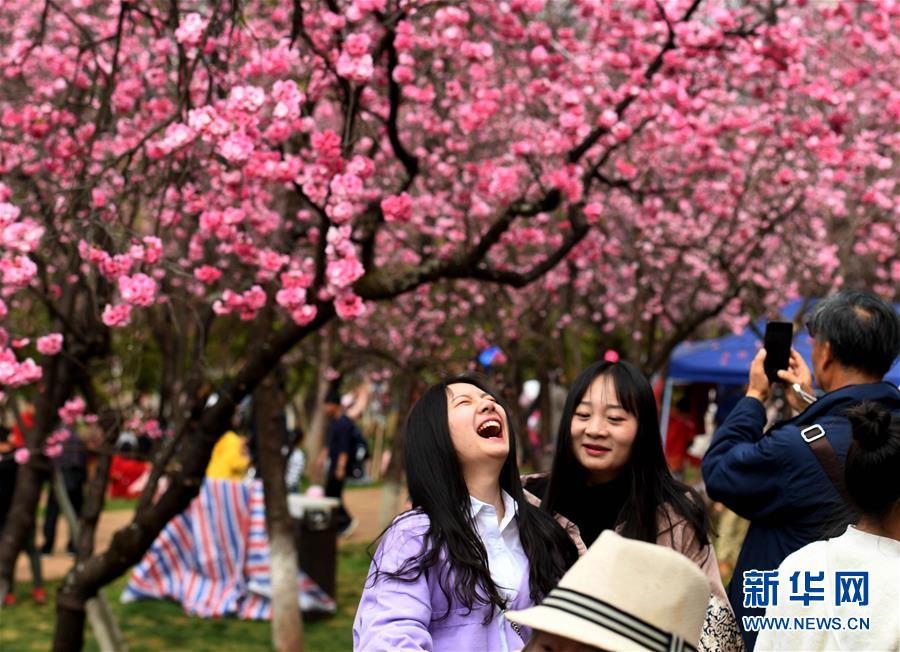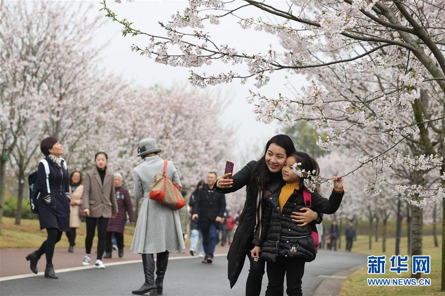 3月18日,两名女子在眉山樱花博览园里自拍留影。当日,第三届眉山樱花节在位于四川省眉山市的眉山樱花博览园开幕,多个品种的樱花次第盛开,吸引了众多市民和游客前来观赏。近年来,当地政府以举办眉山樱花节等一系列绿色生态旅游节会为突破,持续推动绿色发展,眉山生态旅游已受到省内外游客的广泛青睐。 新华社记者江宏景摄